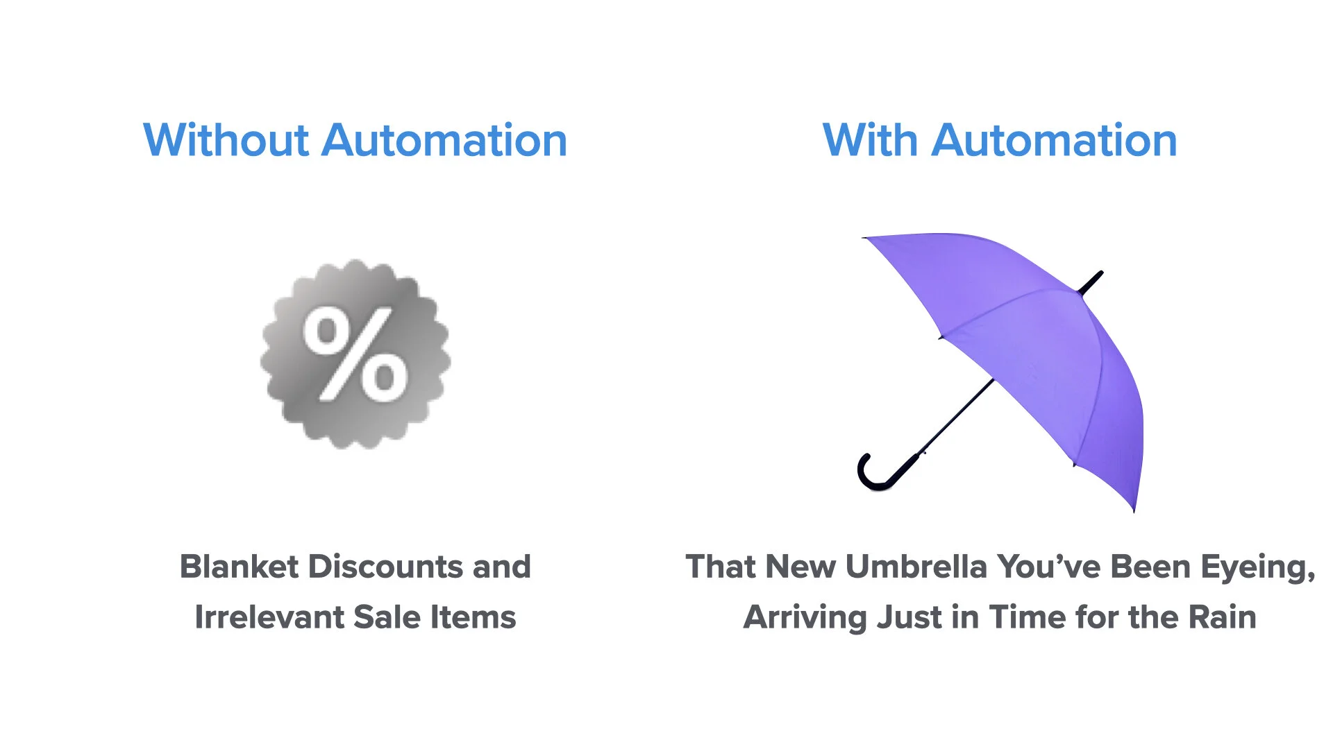 Here’s an example. Let’s say I want to provide a coupon for my eCommerce store to all of my past customers. I could send a blanket email to all of them with a discount code, and hope that they like the items that are on sale. But with automation, I can pull customer information from my CRM, determine each customer’s location, and offer items appropriate for the weather and season where they are. Better yet, I can use their past purchases to determine what types of items they like, and combine those preferences with the weather, their typical budget, and their spending frequency to send them a just-in-time email discount for that new umbrella they’ve been thinking about buying. This is when a simple email starts to feel like magic.